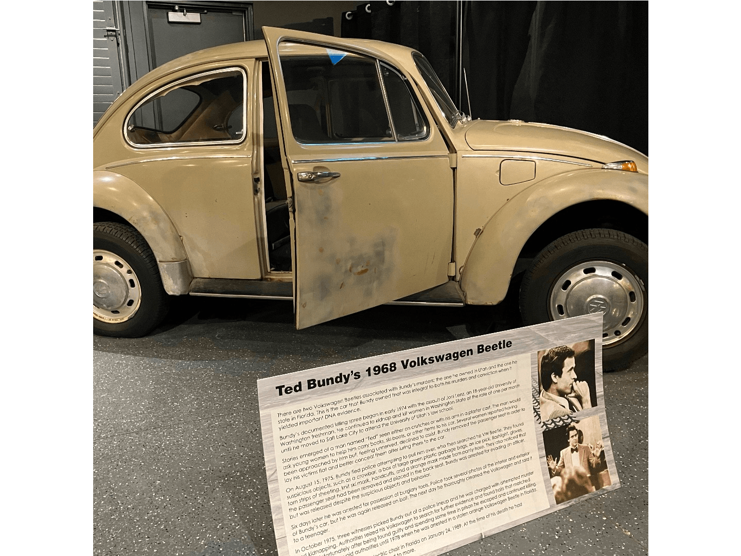 • Look for the famous O.J. Simpson chase Bronco, John Dillinger’s death mask, Al Capone’s rosary, a submachine gun from the movie Scarface, and Ted Bundy’s VW Beetle.